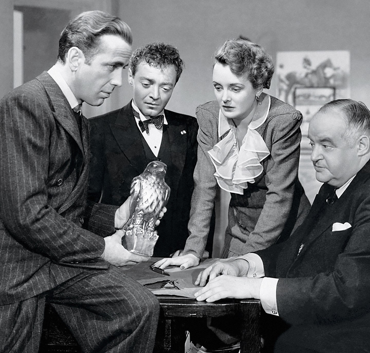 It’s our 30th episode, dollfaces! We watched 1941’s The Maltese Falcon and dug into one of Hollywood’s biggest noir movies. We cover the iconic Humphrey Bogart and his literal presence in our lives, get into the vague history of the MacGuffin storytelling device, talk about how this is an actual mystery we traverse along with Sam Spade, and discuss how no one in the movie is really a good person—not least because everyone’s lying all the time. Katy shares a bonkers (but not so fun) fact concerning the falcon prop’s sculptor, Carrie liked the title treatment’s quotation marks, Maddy draws valid parallels between the “Fat Man” and Professor Slughorn, and Mack did some excellent real detecting and film analysis. We also come up with at least three different spin offs and/or sequels for the Maltese Falcon Cinematic Universe, Mack hosts the first partly-gay Pirate Corner™, we learn about Mary Astor’s secret diaries and what her casting meant to a contemporary audience, discuss the Hayes Code and The Celluloid Closet (again), and get into Guns-As-Penis-Metaphor tropes. We all lean in on our ‘40s radio persona for a bit and lament the lack of pirates and knights after a big title card promise. Give it a listen, baby doll!