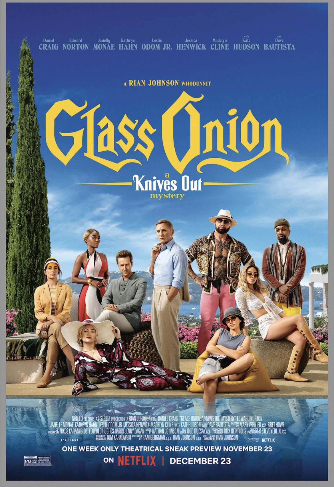 #GlassOnionAKnivesOutMystery#DanielCraig#JanelleMonae#EdwardNorton#KateHudson#KathrynHahn#LeslieOdomJr#DaveBautista#MadelynCline#JessicaHenwick#RianJohnson#netflix